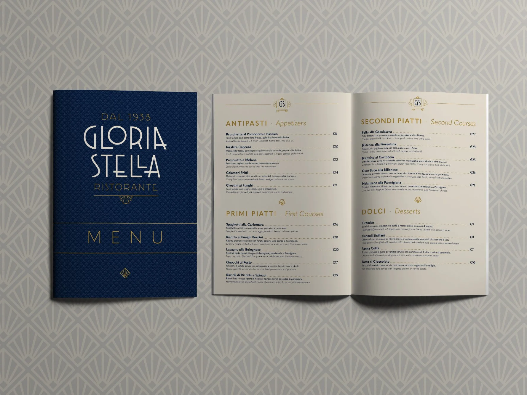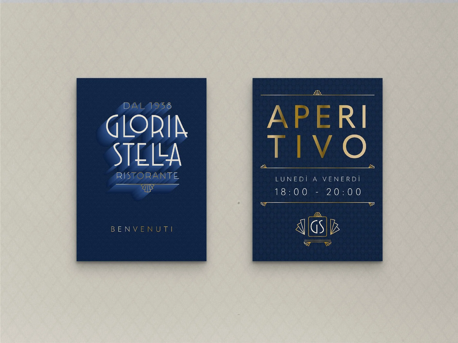 Inspired by Italian Art Deco of the 1930s, the branding reflects an elegant yet welcoming atmosphere, embodying a space for good times, exquisite food, and engaging conversations. The project draws from personal nostalgia: it imagines what it would be like if my family had owned a restaurant. Inspired by cherished memories of enjoying my Nonna’s pasta and playing card games with her and her siblings, the design honours the era in which my grandmother and her siblings were born. Gloria Stella, named after my great aunt who was born in 1938, represents a touchstone of family tradition. Today, she still shares those joyful moments with me whenever I visit Argentina.